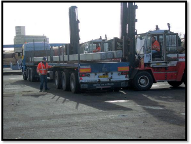 Palen aanvoer per schip, direct op de auto of worden na opslag met twee heftruck`s laden.