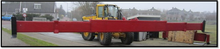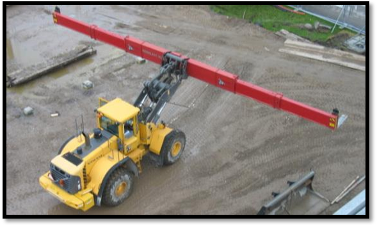 De Volvo L150E, in speciale uitvoering met het ‘buismodel’ uit een deel of de ‘vijfdelige’ nieuwe palendrager. De capaciteit van beide palendragers is 16 ton, met een (variabele) maximale lepelafstand van 16.00 meter.