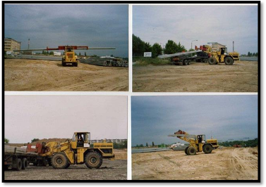 Vrij kort na de val van de ‘muur’ had Voorbij funderingstechniek een heiwerk te Stettin in Polen aangenomen. Ongeveer 1800 palen werden per schip in de haven aangevoerd en worden per vrachtauto naar het werk getransporteerd. Een Poolse shovel, uitgevoerd met de driedelige palendrager die speciaal voor dit soort projecten wordt verhuurd, heeft de palen op het werk gelost en op tasvelden opgeslagen.